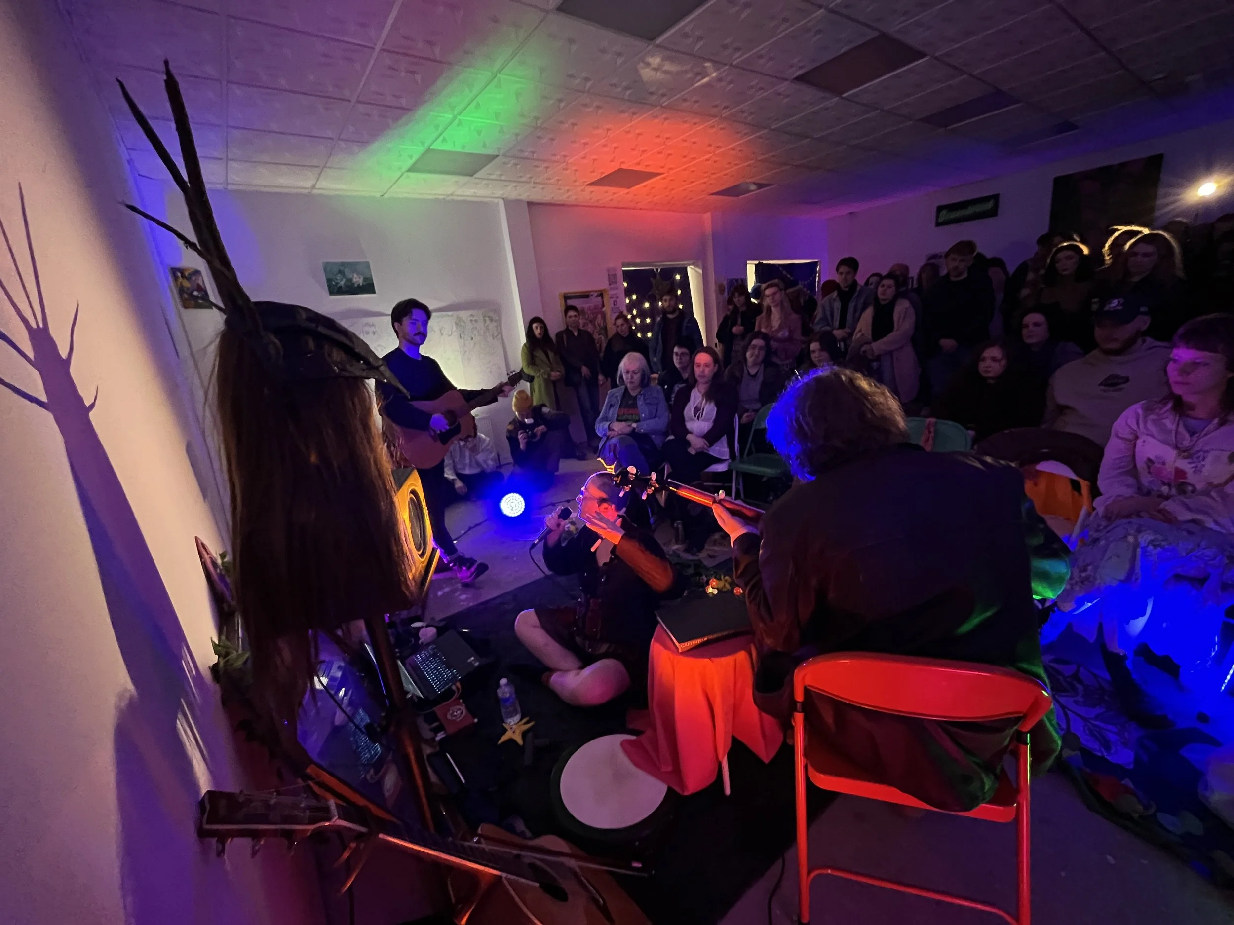 Every single person that I asked for help said yes and showed up for me in lots of wonderful ways- performers, artists, photographers, audience members and everyone in between. It took a village to put this self funded not-for-profit event on. Stephen set up spot lights and handed out salt and chili deep fried mushrooms. A girl from the audience bought more wine for the raffle table in the middle of the night, I still owe her twenty quid. Costas, an artist from the Netherlands, made a three headed psychedelic mask especially for the occasion. Carly helped me decorate the gallery. Matthew helped me pack it all away. Everyone showed up in every way they could. The support I received in planning and executing the whole thing was unreal. I managed to throw everyone a tenner with the help of tips from the best audience in Belfast.