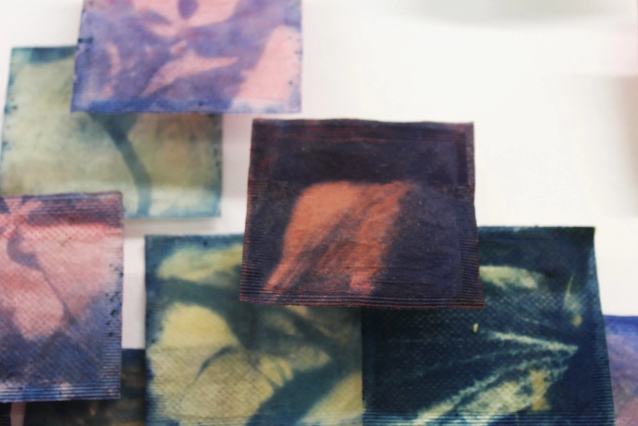 Each tea bag is cut at the back, then with a tiny brush you remove the contents, and then the cyanotype process where you have the photographs, then you coat the tea bag paper with chemicals, expose the tea bag to the photographs and they are rinsed out with water after that
